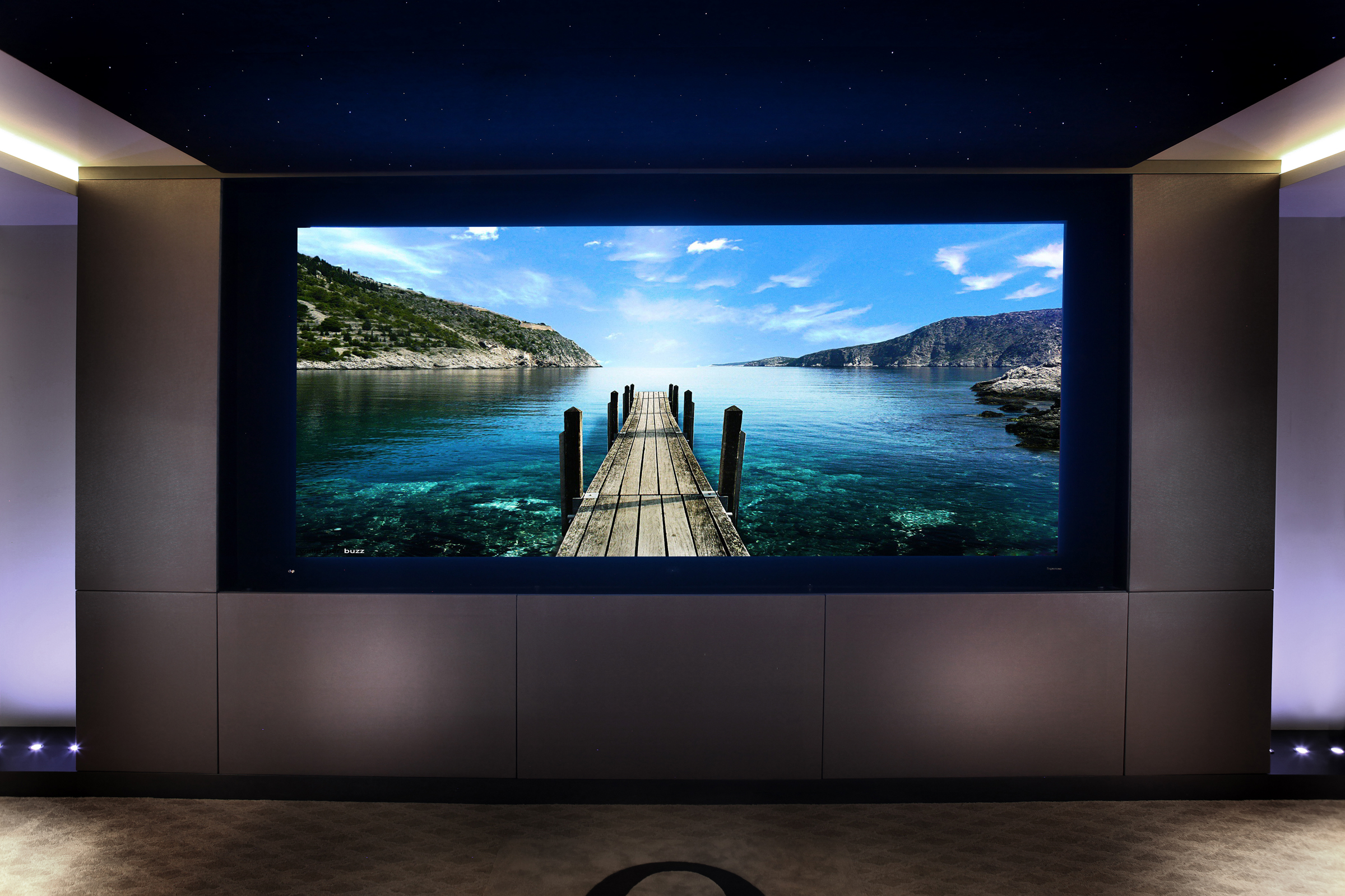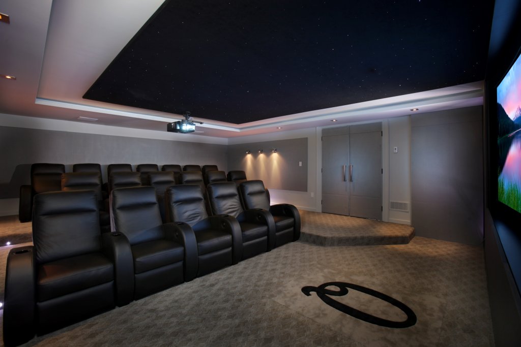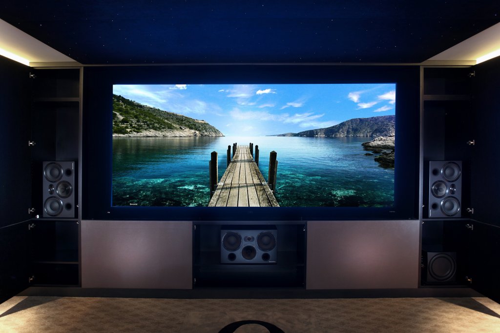 A DnP Supernova Epic 132 inch motorized masking screen was chosen to give the clients a true Cinematic experience, no matter the movie’s format it can be watched in full resolution with no black bars, just as in a commercial movie theater. The screen sits flush in a recessed opening within the room’s mill work.