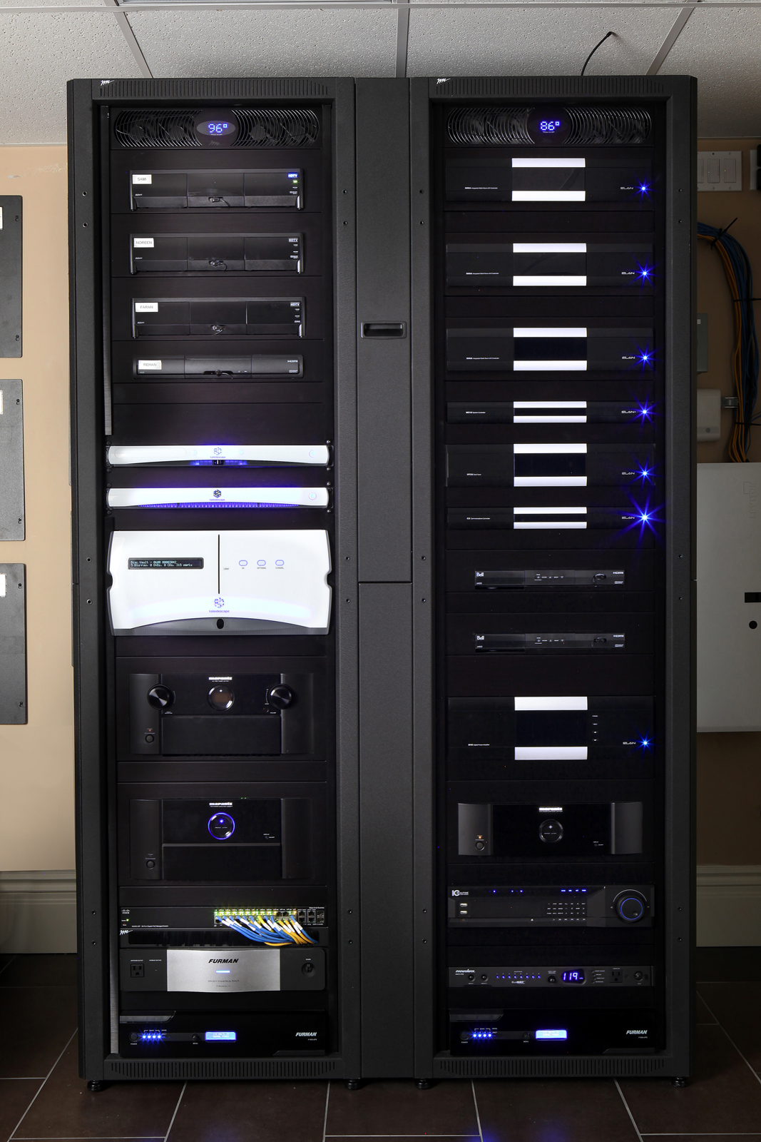 We selected Bowers and Wilkins Custom Theater line of speakers for this project. These speakers have the ability to reproduce all aspects of a movie soundscape and delight even the most discerning audiophile. The three front CT7.3 LCR’s are mounted with in the proscenium mill work while the mid and rear speakers are concealed in the ceiling.