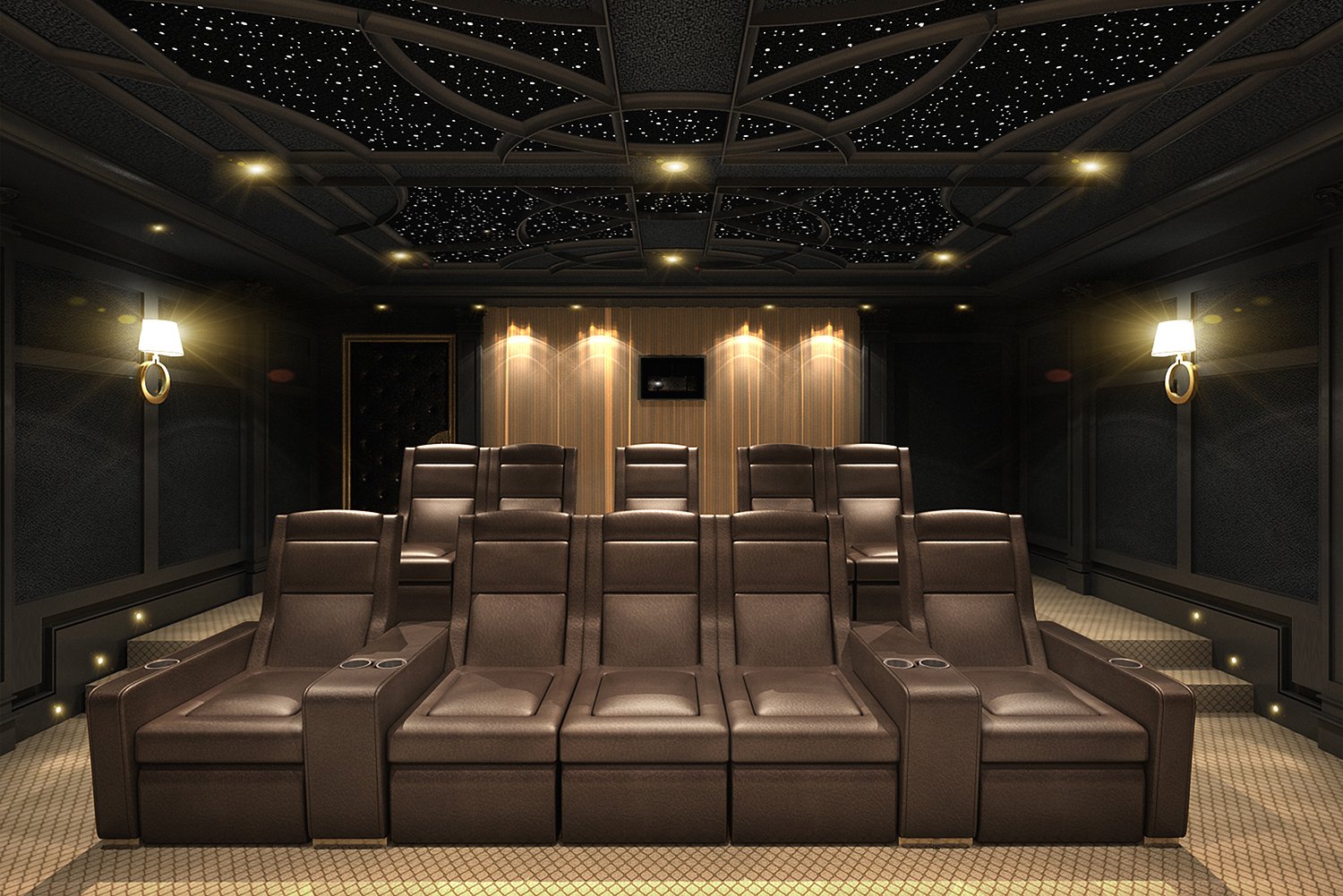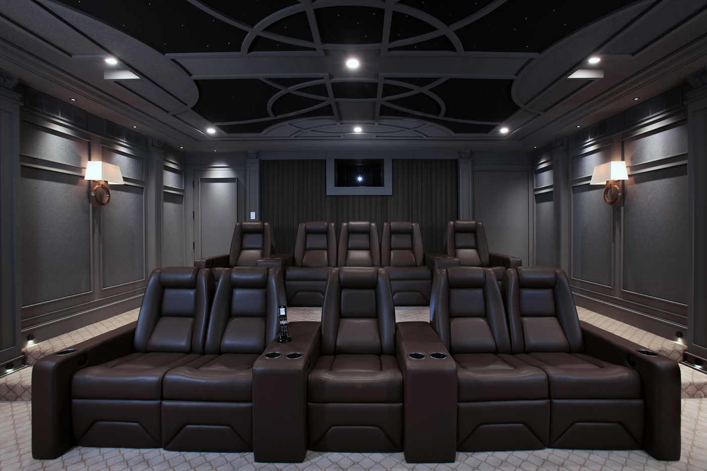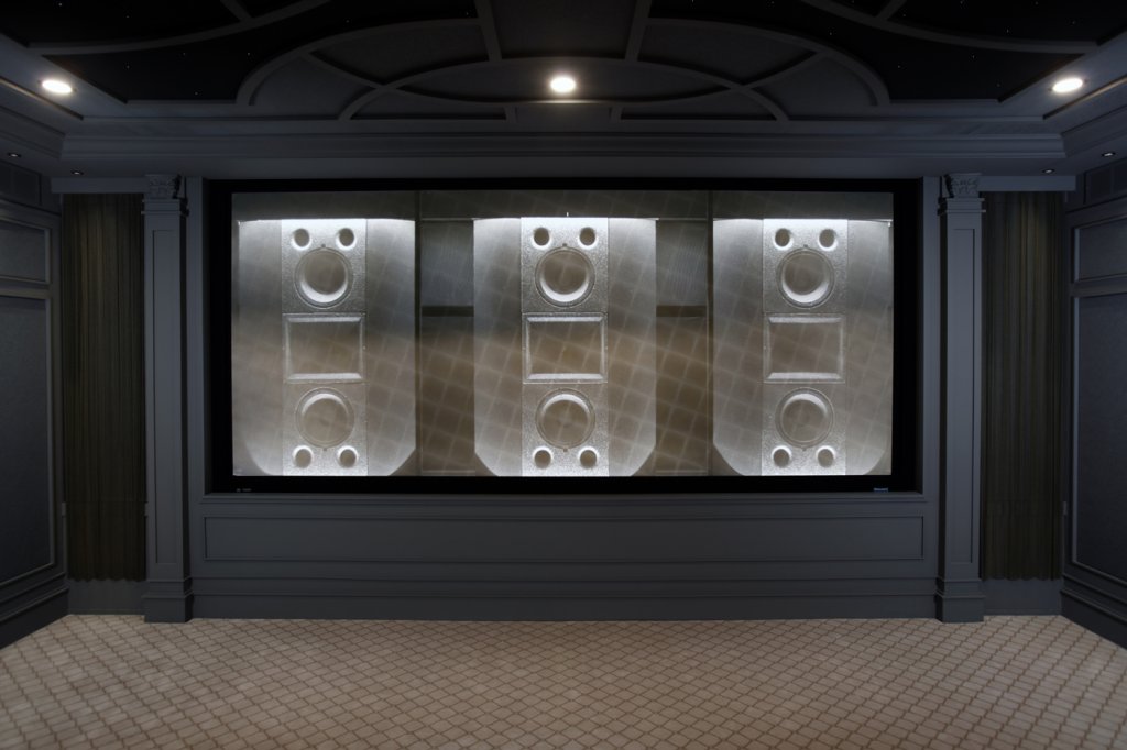 The finishings were meticulously chosen to complement and enhance the technical merits of the room. Walking into the room the massive screen, starcoustic ceiling and impressive millwork immediately grab your attention. Comfortable theatre seating, heart-pounding audio and acoustical wall treatments result in the ultimate immersive theater experience.